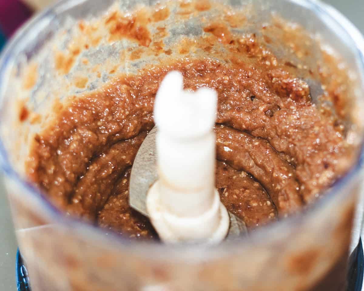 - Process the dates on high until smooth, about 4-5 minutes. You may be tempted to stop once the dates are broken down. Don’t. Keep processing. The colour will continue to lighten and the end product will be much smoother.